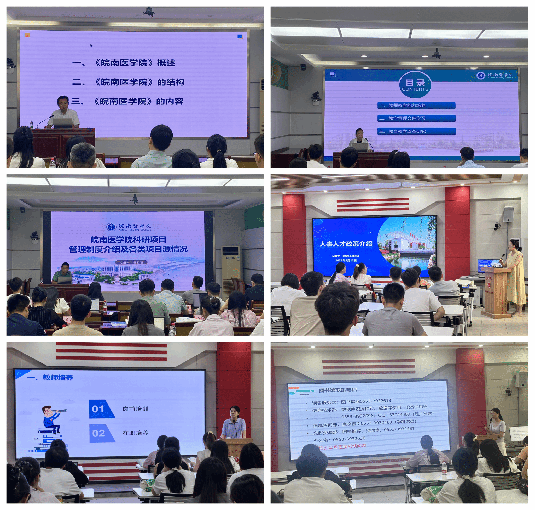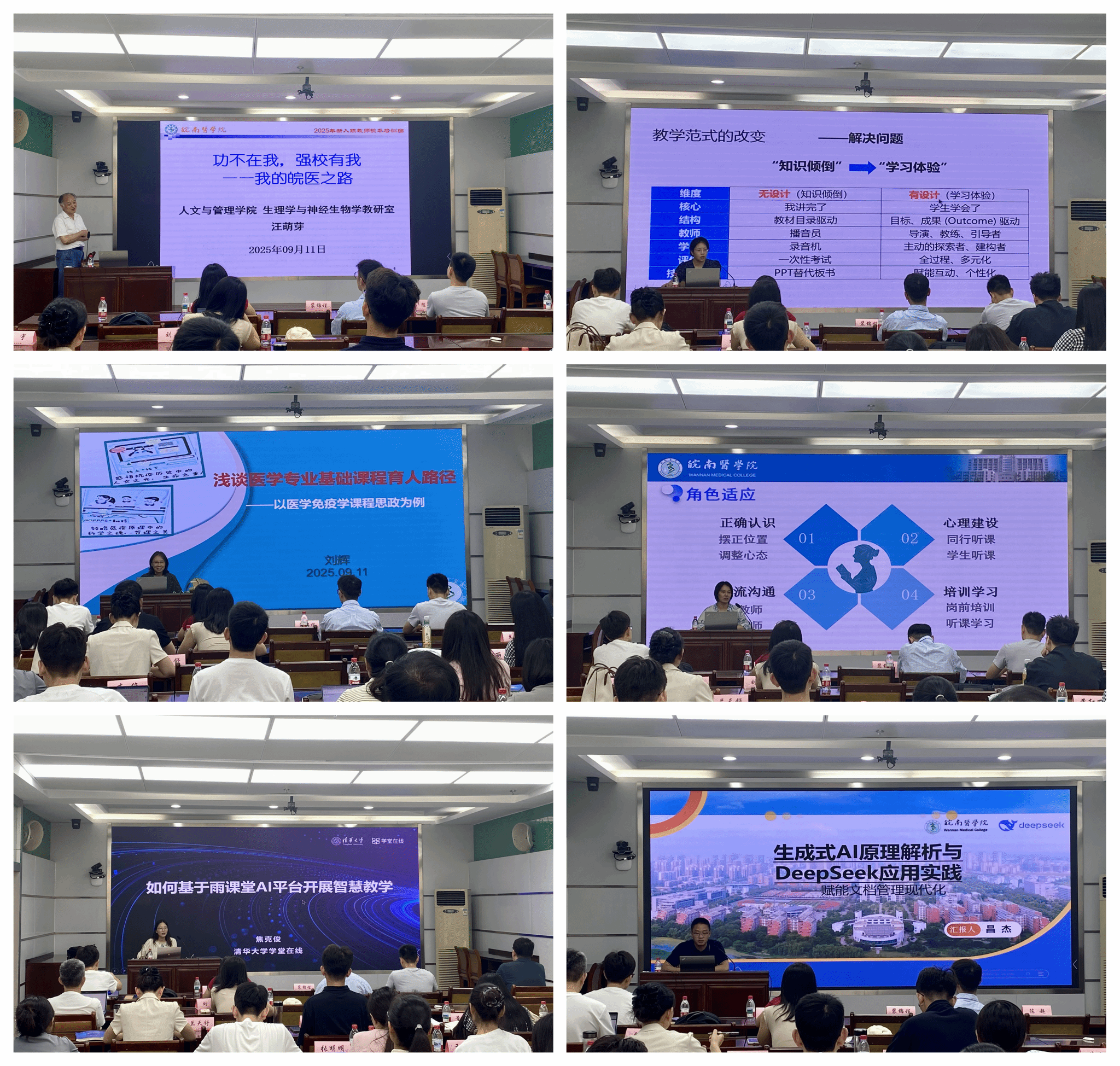 为提升新教师的教学能力,学校邀请了校内教学经验丰富的骨干教师和教学专家开展教学技能培训。人文与管理学院汪萌芽,基础医学院刘辉、彭彦霄、产翠翠分别以“功不在我,强校有我——我的皖医之路”“混合式教学设计的基础建设”“教学设计的智能升级”“青年教师的‘教’与‘学’” 为题,与新教师深入交流教学经验与技巧。培训内容涵盖教学设计、课堂组织与管理、教学方法与手段、教学评价等方面,将抽象的教学理论转化为具体可操作的教学实践,让新教师们直观领略优质课堂的魅力,切实掌握实用的教学技能,为站稳讲台奠定坚实基础。
