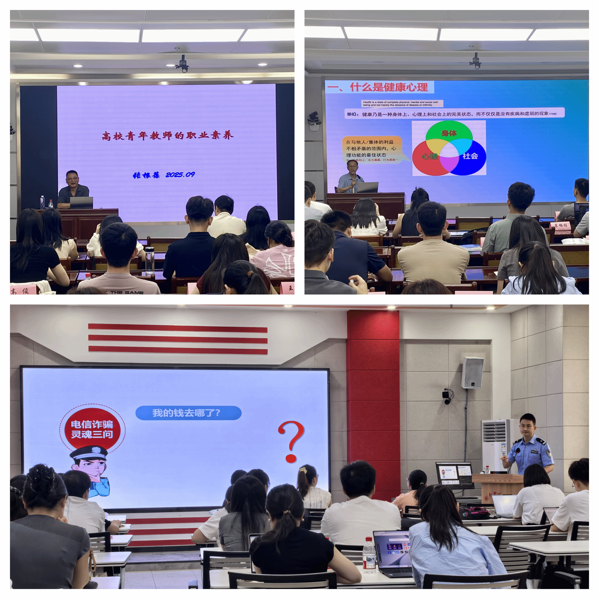 校关工委张根葆、刘新民分别就青年教师职业生涯规划、心理健康维护作专题讲座,从职业发展方向选择、目标设定、规划实施到心理健康认知、压力应对、情绪管理等方面,为新教师提供专业指导与建议,鼓励新教师立足岗位,做好职业生涯规划,正确认识自我,保持积极乐观的心态,增强自我成长的动力与能力。芜湖市公安局网安支队五大队大队长衡鹏量讲解电信网络防范措施,进一步提高新教师的安全防范意识,确保新教师在安全稳定的环境中工作与生活。
