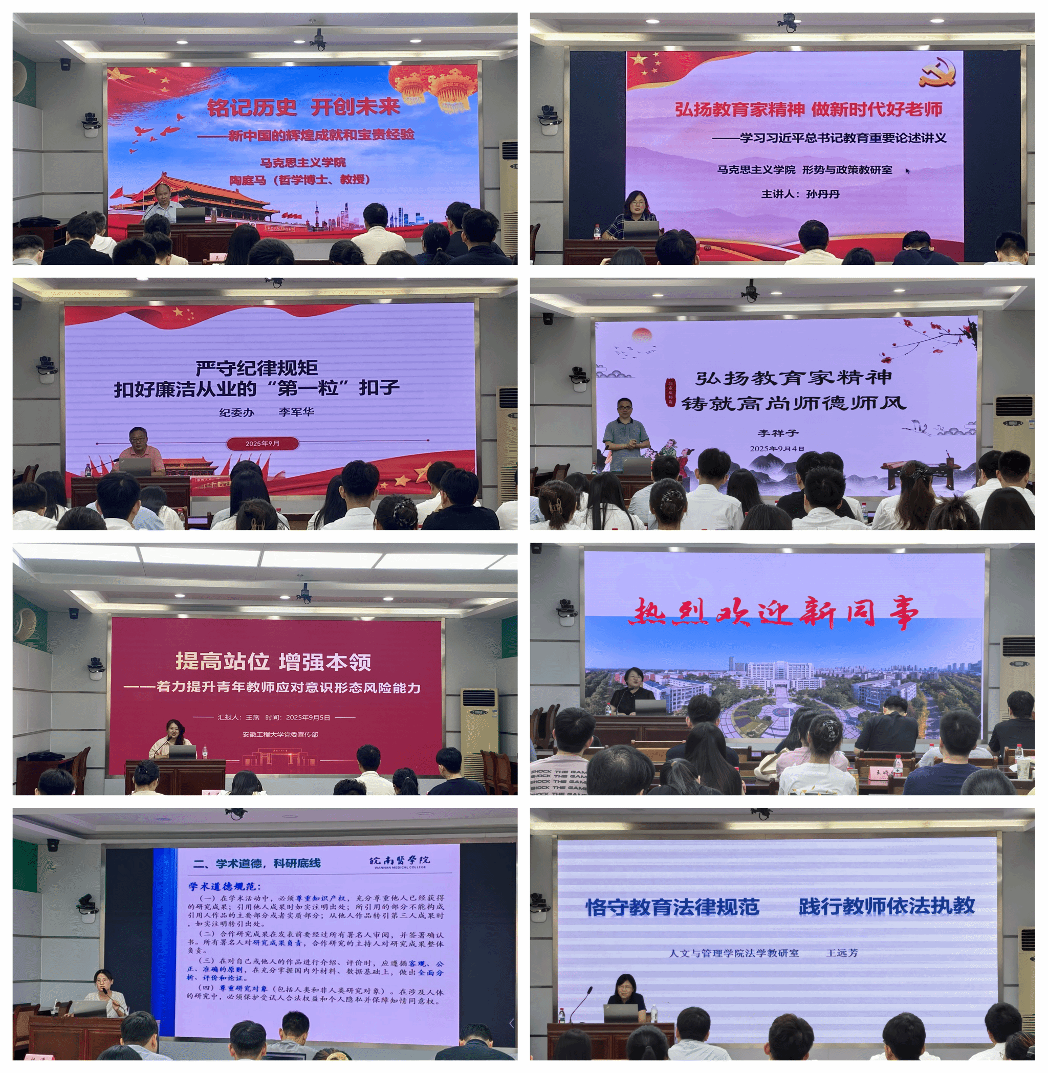 培训期间,学校将思想政治教育与师德师风建设贯穿始终。马克思主义学院院长陶庭马、教师孙丹丹,人文与管理学院教师王远芳分别围绕新中国成立以来的伟大成就与宝贵经验、《习近平总书记教育重要论述讲义》、《教育法》、《教师法》等内容展开深入解读,引导新教师坚定理想信念,厚植爱国情怀,增强依法从教意识。校纪委副书记李军华、人事处处长李祥子分别就高校党纪法规、师德师风政策作专题报告,深入剖析《新时代高校教师职业行为十项准则》《中国共产党纪律处分条例》等文件精神,并结合实际案例进行警示教育。安徽省“最美教师”、校“十佳教师”袁慧分享了自己在教学与育人过程中的亲身经历与感悟,用生动的案例诠释了高尚师德的内涵与价值。此外,安徽工程大学宣传部副部长王燕就意识形态工作作专题报告,组织全体新教师观看高校保密教育视频,进一步强化了新教师的意识形态与保密安全意识。